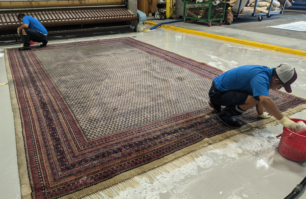 يقوم الفريق بفحص نوع السجاد لتحديد الطريقة الأنسب (بخار، تنظيف جاف، أو غسيل رطب).